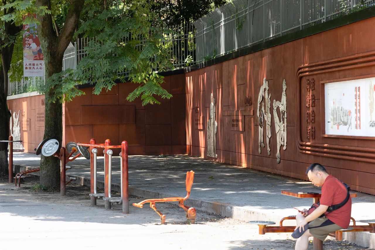 龍井公園地處龍井村核心地區(qū),緊鄰廣益中學(xué)和農(nóng)貿(mào)市場,承載著居民日常休閑活動,是龍井村更新提升中重要的一環(huán)。設(shè)計通過更新場地的功能設(shè)施,增設(shè)文化景墻、休閑健身設(shè)施、公共休閑座椅,有效提升了公共空間的美觀度、舒適性與便利性。改造后,人們在濃厚的文化氛圍里活動休憩,瀏覽文化墻上篆刻的過往,歷史的記憶與現(xiàn)在的生活相呼應(yīng),形成動人的空間記憶。