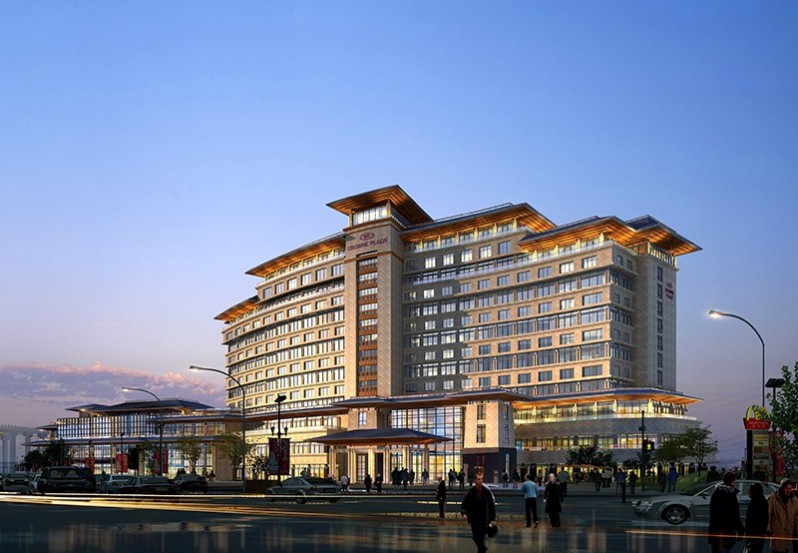 項目位于江蘇省揚州市,北臨文昌大橋,西臨京杭大運河,南臨湖濱規(guī)劃道路,東靠京杭路,是揚州廣陵新城“京杭之心”規(guī)劃區(qū)域內(nèi)重要的建筑。揚州市東部,北臨文昌大橋,西臨京杭大運河,南臨大湖,東靠京杭路。項目利用基地內(nèi)的多種自然條件和景觀優(yōu)勢,平面布置呈東西走向,沿南側(cè)水體弧線舒展布局,使景觀價值在每間客房得到充分的體現(xiàn),按照廣陵新城的規(guī)劃設(shè)計理念,建筑與湖心形成向心關(guān)系,體現(xiàn)出完整的的濱水空間,創(chuàng)造豐富的親水體驗。建筑立面風格,端莊氣派,立面設(shè)計成三段式的處理,建筑底部為石材面飾,彰顯氣派厚重感;中間為虛實對比的分層條窗,頂部為簡約的坡屋頂,整體建筑極具現(xiàn)代感又不失對地域文化的詮釋。
